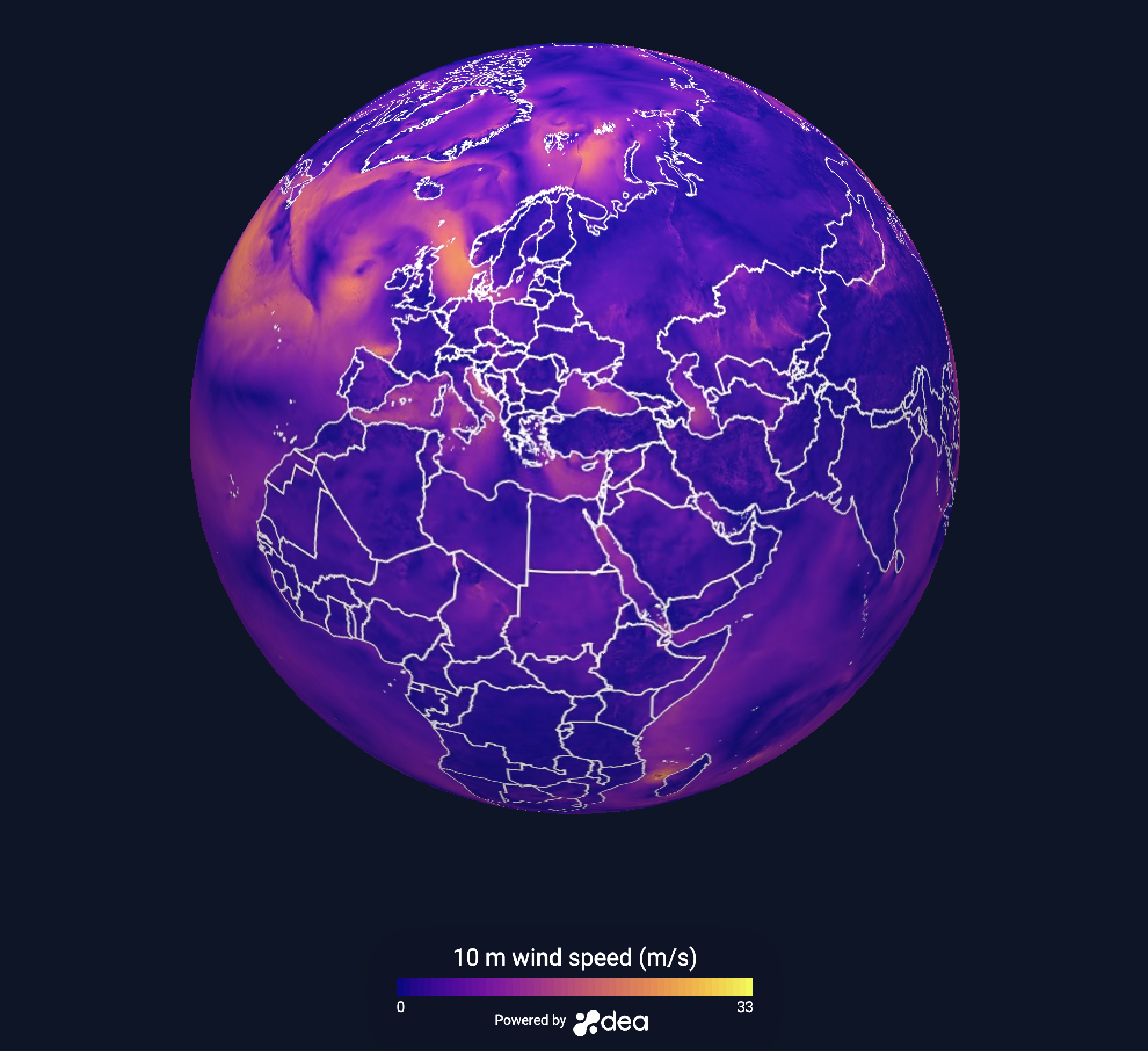 Figure 1: January 2024 10 minute wind speed map from DestinE (Image Credit: Destination Earth)