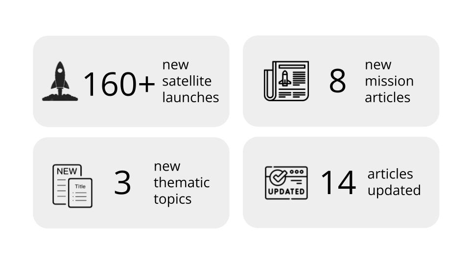 The period July - September 2024 saw a number of updates and additions to the EO Portal. More than 160 new launches have taken place over the period including notably SpaceX’s Falcon 9 Transporter-11 mission. 11 new EO Portal articles covering new missions and thematic topics have been published, and 14 articles have been updated with new information.