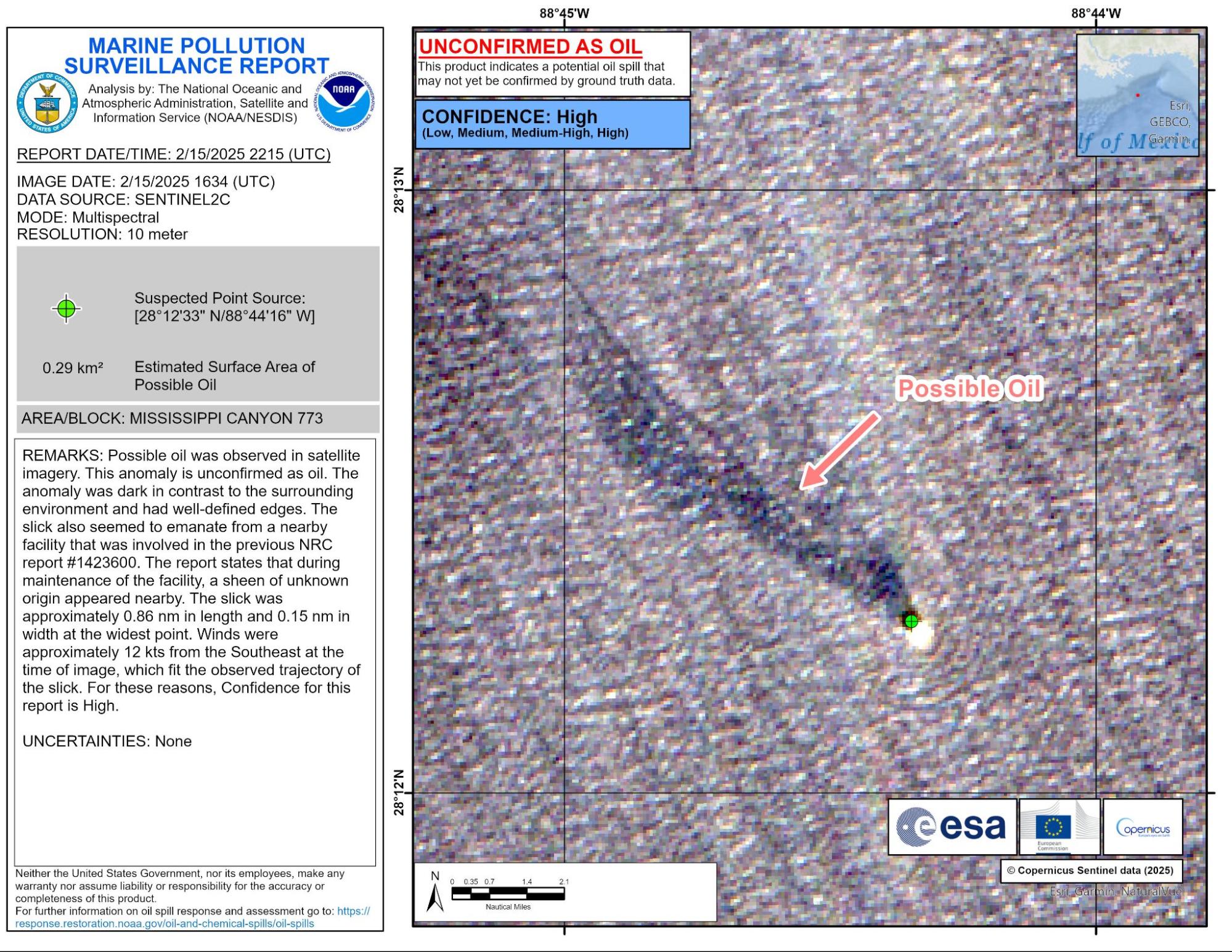 The Marine Pollution Surveillance Report (MPSR) is a suite of tools developed by the National Environmental Satellite, Data, and Information Service (NESDIS) Satellite Analysis Branch (SAB) to identify and showcase marine anomalies, primarily oil spills, in U.S. waters. The software uses a combination of multispectral and Synthetic Aperture Radar (SAR) satellite imagery and aerial photography to detect said anomalies. 16)