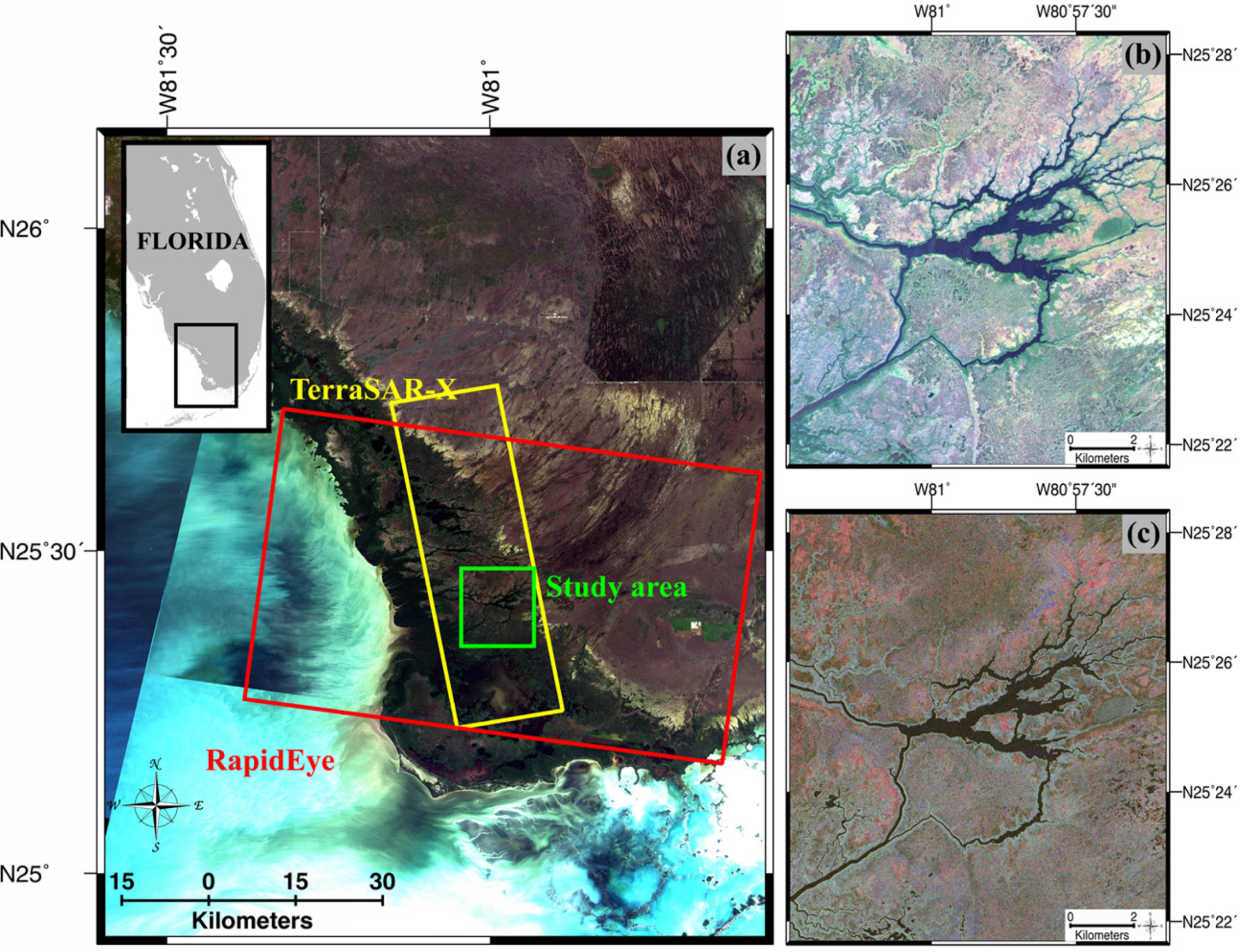 Figure 8: Pauli Decomposition Visualisation of the western Florida Everglades, including imagery from TerraSAR-XRapidEye, and Landsat. (a) Location of the study area in the western Everglades, shown with a Landsat ETM+ image rendered as a true-color composite. The frames mark the swath locations of data acquired by X-band TerraSAR-X SAR (16 April 2010) and RapidEye optical (3 December 2010) satellite. The green frame indicates the location of main study area. (b) RapidEye multispectral true-color composite image over the study area. (c) Pauli decomposition of TerraSAR-X SAR image as a color composite image: HH-VV (red), HH+VV (blue), and HV (green). (Image Credit: Hong et al, 2015)