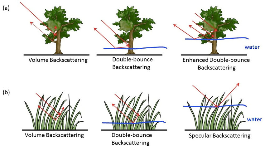 The enhanced information provided by PolSAR is possible due to the scattering of radio waves with different surfaces. The four primary scattering effects in PolSAR are: