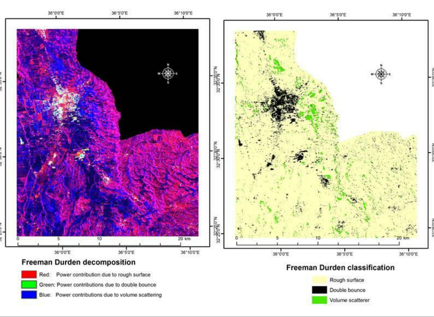 Polarimetric decomposition is effective for urban monitoring through its identification of double-bounce scattering, forestry studies through volume scattering, and water body reflections through surface scattering. The use of these three scattering mechanisms is known as Freeman-Durden Decomposition. 2) 4) 5) 6) 7)