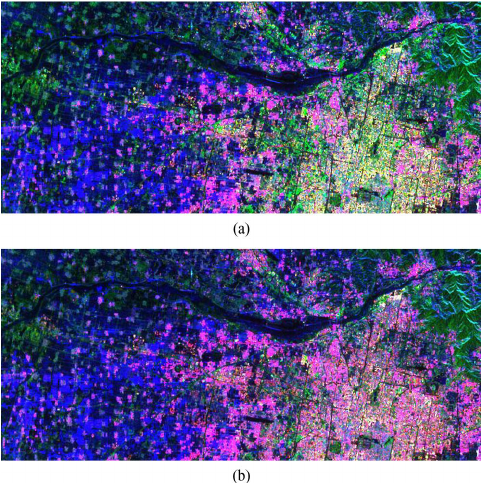 Figure 6: Yamaguchi 4-component decomposition ALOS imagery over Beijing. (b) shows Yamaguchi decomposition with disorientation applied (Image credit: JAXA)