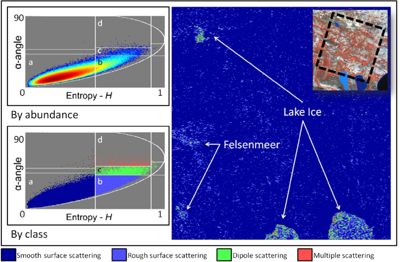 Figure 7: Cloud-Pottier analysis of two Fine-Quad RADARSAT-2 scenes from 8 and 23 July 2010. (a) Low entropy (smooth) surface scattering; (b) Medium entropy (rough) surface scattering; (c) Medium entropy dipole scattering; (d) Medium entropy multiple scattering. (Image credit: Collingwood et. al, 2014).