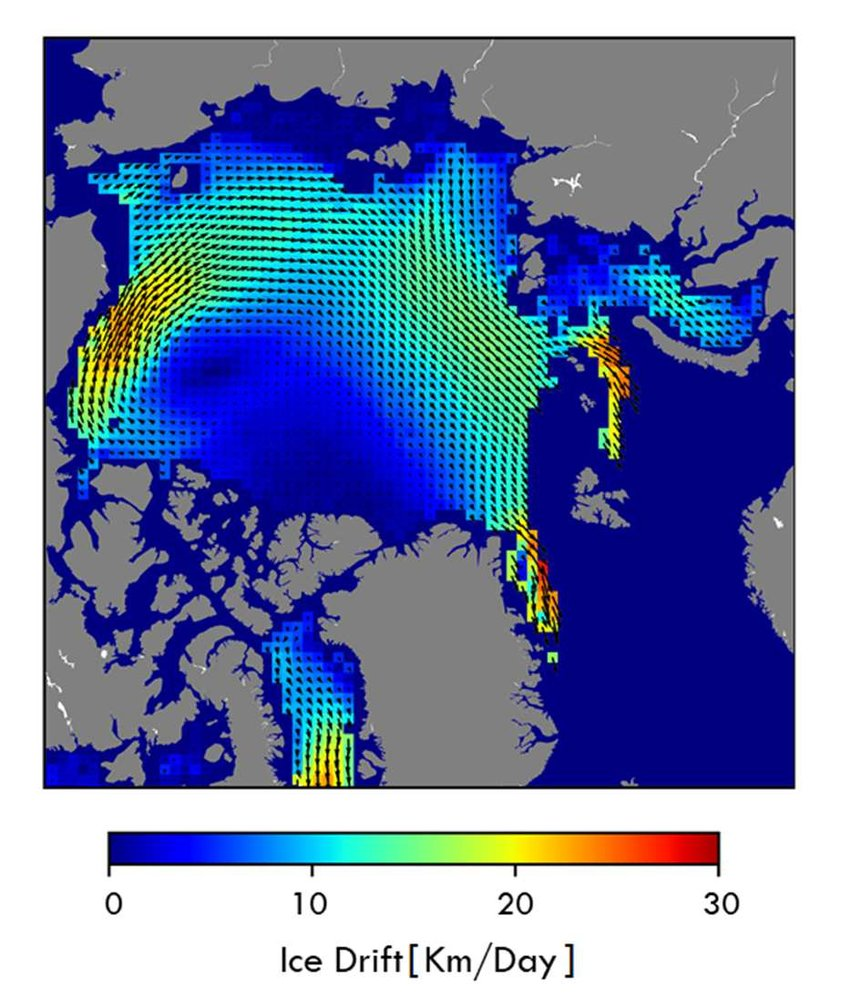Ice drift maps (as shown in Figure 12), showing how sea ice moves as a result of ocean currents and winds, are constructed from sequential satellite images taken every one to three days, either by passive microwave radiometers or high resolution SAR. While these techniques are effective in tracking main ice packs, ice floes on the edges move too rapidly to be followed by imagery. Embedded buoys with fitted GPS provide higher frequency measurements of ice drift, as they transmit position data every few minutes. 11)