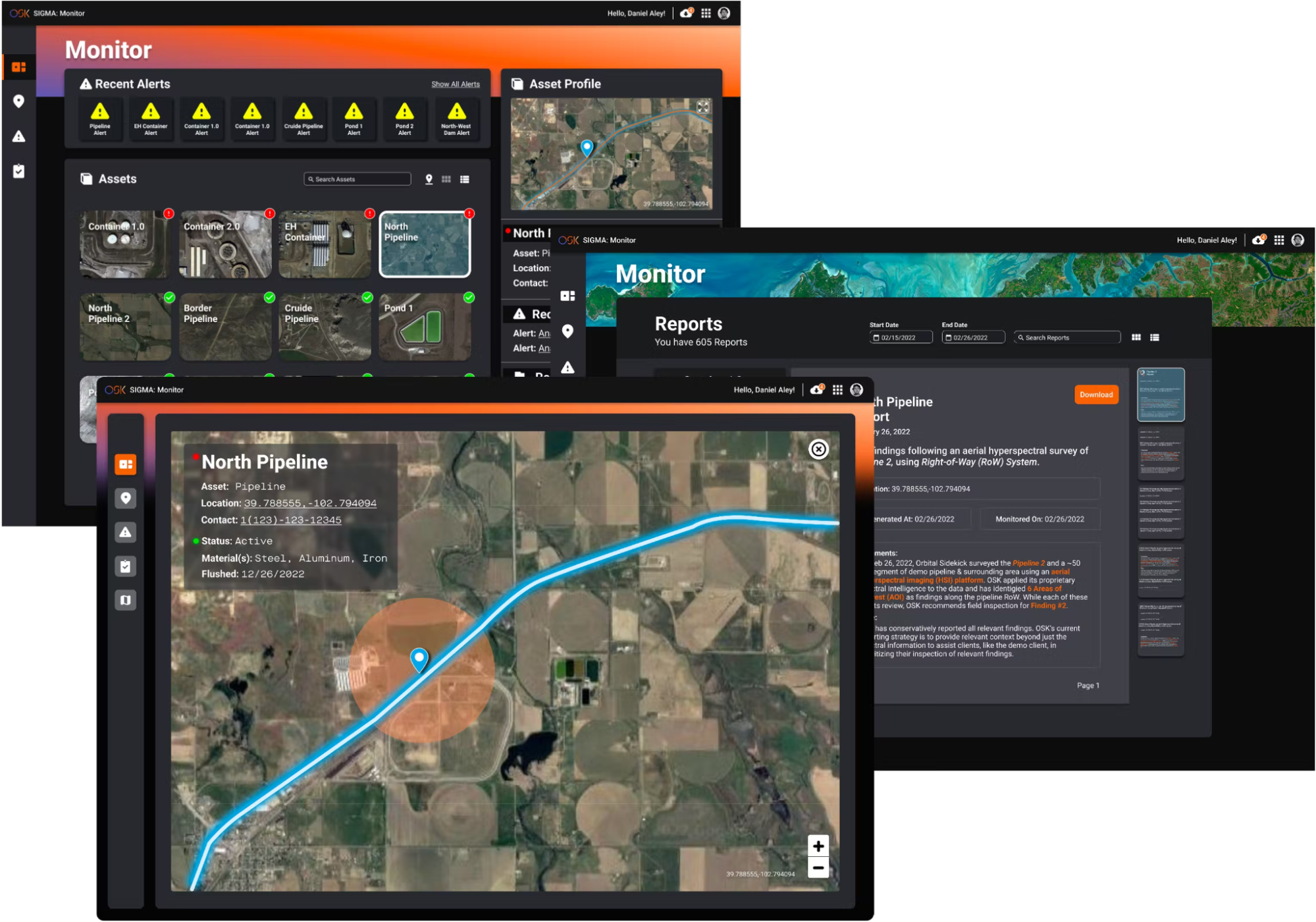 SIGMA™ Monitor is an integrated, customizable platform that provides real-time reporting for global persistent monitoring. Through SIGMA Monitor, OSK’s customers are able to track their site activity as often as daily, with revisit options to suit tailored requirements. It will also provide chemical IDs and classification down to the molecule with Spectral IntelligenceTM, and real-time reporting with insights and notifications enabling rapid response.