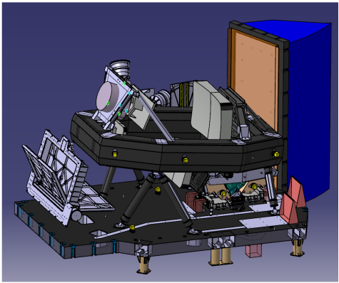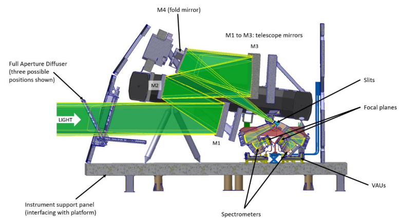 The system uses a Three Mirror Anastigmat telescope (TMA) with mirrors to direct incoming light to three identical spectrometers. Each spectrometer processes one-third of the swath while covering the full spectral range. A neutral fold mirror distributes the light to each spectrometer, as seen in Figure 9, where spectral dispersion is achieved through dual-blazed gratings. The dispersed images are detected by Mercury Cadmium Telluride (MCT) detectors, each with 3000 x 512 pixels. These detectors require cooling to around -100℃. This is achieved using a thermal control system that includes a baffled cryogenic radiator, graphite thermal straps, and ethane heat pipes. All optical elements are mounted on a carbon fibre reinforced polymer (CFRP) bench structure, designed to maintain thermal and mechanical stability. The temperature of the optical components is stabilised at around 20℃. 7) 13)