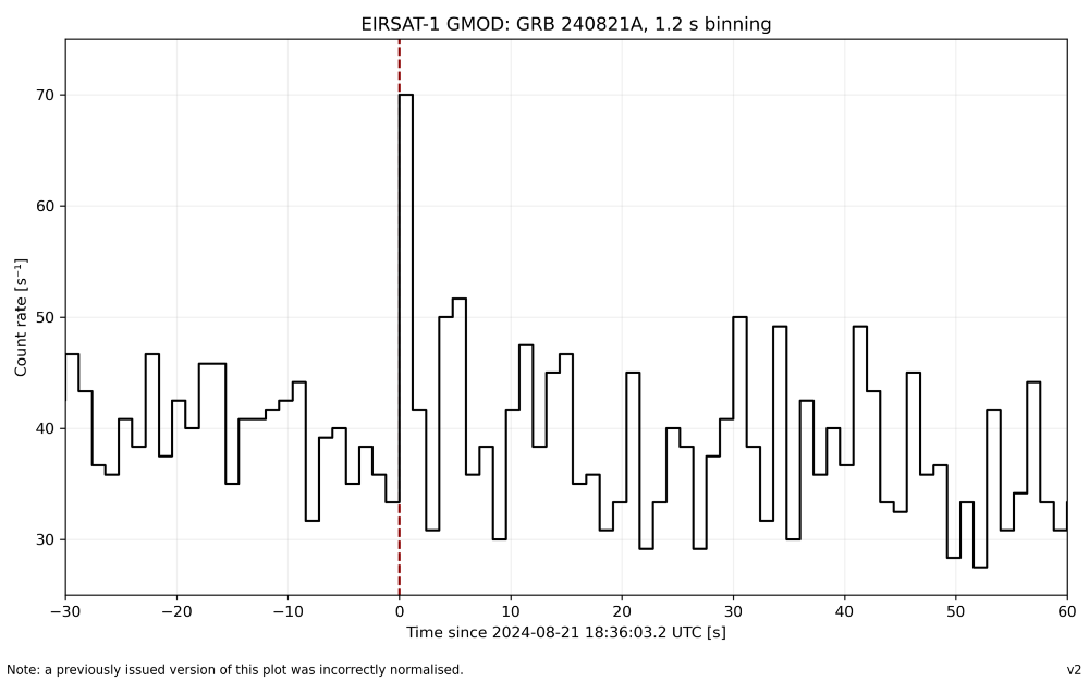 • August 21, 2024: EIRSAT-1 successfully detected two gamma-ray bursts (GRBs) using its GMOD detector, marking a major scientific achievement. It identified GRB240821B, a long burst caused by the death of a massive star, followed just 79 minutes later by GRB240821A, a rarer short burst likely from two neutron stars colliding. The student-built CubeSat from University College Dublin (UCD), has completed over 4500 Earth orbits and traveled approximately 200 million km since its December 2023 launch, contributing valuable data to the gamma-ray burst scientific community. 17)