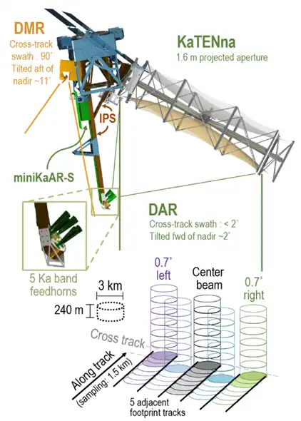 The Ka-band radars have a horizontal resolution of 3.1 km, a vertical resolution of 0.24 km, radar sensitivity of 12 dBZ, swath width of 9 km and a 7 kg mass. The radiometer can measure at five frequencies of 87, 165, 174, 178, 181 ± 0.5 GHz with horizontal resolution of 16 km, a swath width of 1000 km and a mass of 3.8 kg.