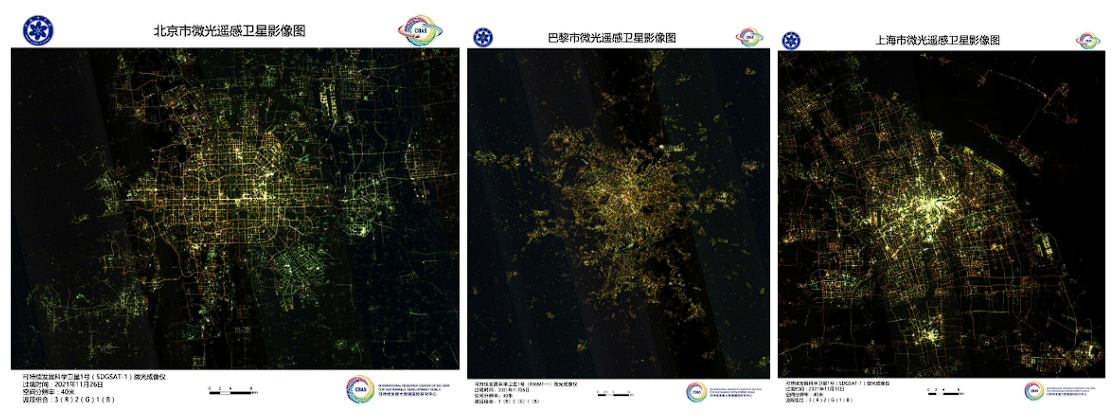 - December 20, 2021: SDGSAT-1 downlinked its first remote sensing images of multiple cities and regions, including Beijing, Shanghai, the Yangtze River Delta, Lake Namtso in Tibet, Aksu Prefecture in Xinjiang, and Paris in France. 23) 24)