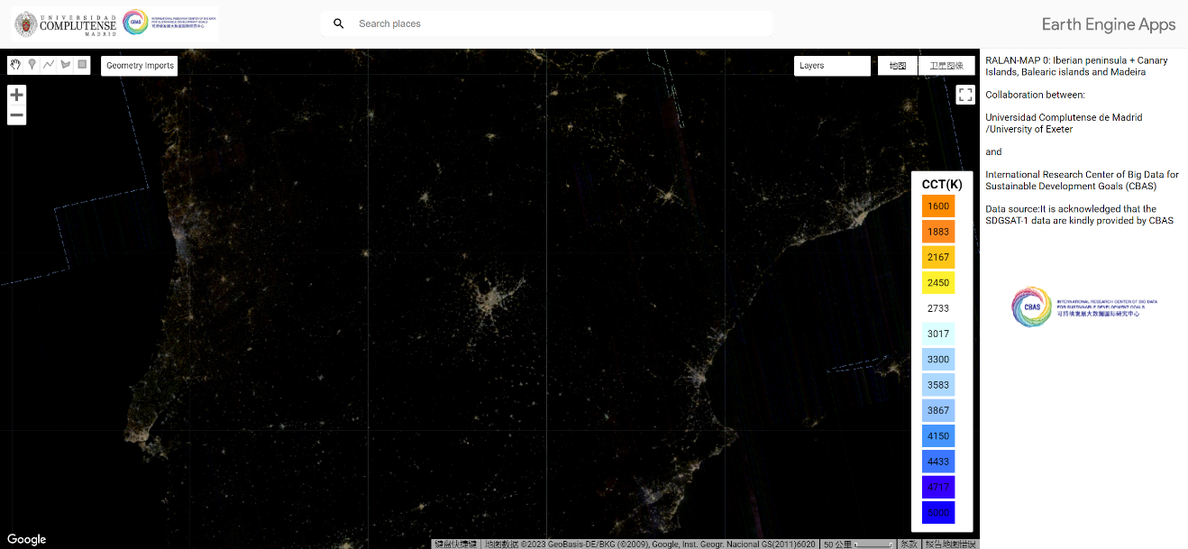 - October 31, 2022: CBAS and Complutense University of Madrid jointly released the first light pollution data of the Iberian Peninsula, Spain, based on three-band color low-light data from GLI sensor on board SDGSAT-1. The data is accessible here: https://pmisson.users.earthengine.app/view/sdgsat-1-p-iberica (shown in Figure 11). 16)