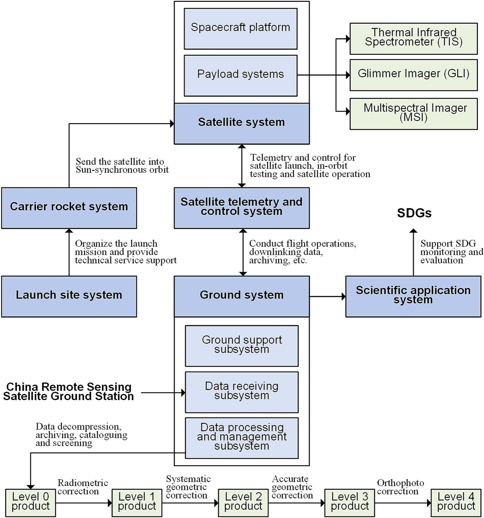 The decompressed L0 raw data undergoes radiometric correction for the Level 1 (L1) product. The Level 2 (L2) product is derived from the L1 data through systematic geometric correction. Using ground control points (GCPs), precise geometric corrections are then applied to produce the Level 3 (L3) product. The L4 data products are based on L3 products that have been ortho-rectified using a Digital Elevation Model (DEM) so that each pixel accurately corresponds to its real location on Earth, and outputted in a standardised format. The data processing subsystem can automatically generate L4 products within 24 hours of data reception. These products are uploaded onto the SDGSAT-1 Open Science Program platform to be freely accessible to the global scientific community for a wide range of SDG-related research and applications. 1) 2)