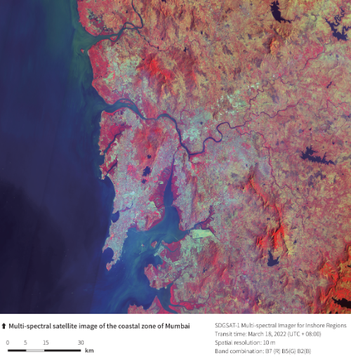 SDGSAT-1 imagery can be used for applications in urban development, disaster response, environmental change tracking, agricultural productivity improvement, and marine conservation. The high-quality imagery of urban lighting patterns, industrial activity, and environmental changes, supports evidence-based decision-making that directly contributes to the implementation of the UN 2030 Agenda. 1)