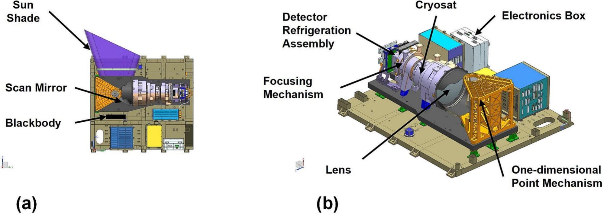 The TIS optical system adopts a whisk-broom mechanism, utilising four refractive lenses and a temperature control system to detect thermal variations in Earth's surface. These detections have an accuracy of noise equivalent differential temperature (NEDT) under 0.07 K at 300 K, with a spatial resolution of 30 m and a cross-track swath width of 300 km across three spectral bands: 8.0–10.5 μm, 10.3–11.3 μm, and 11.5–12.5 μm. 26) 1) 6)