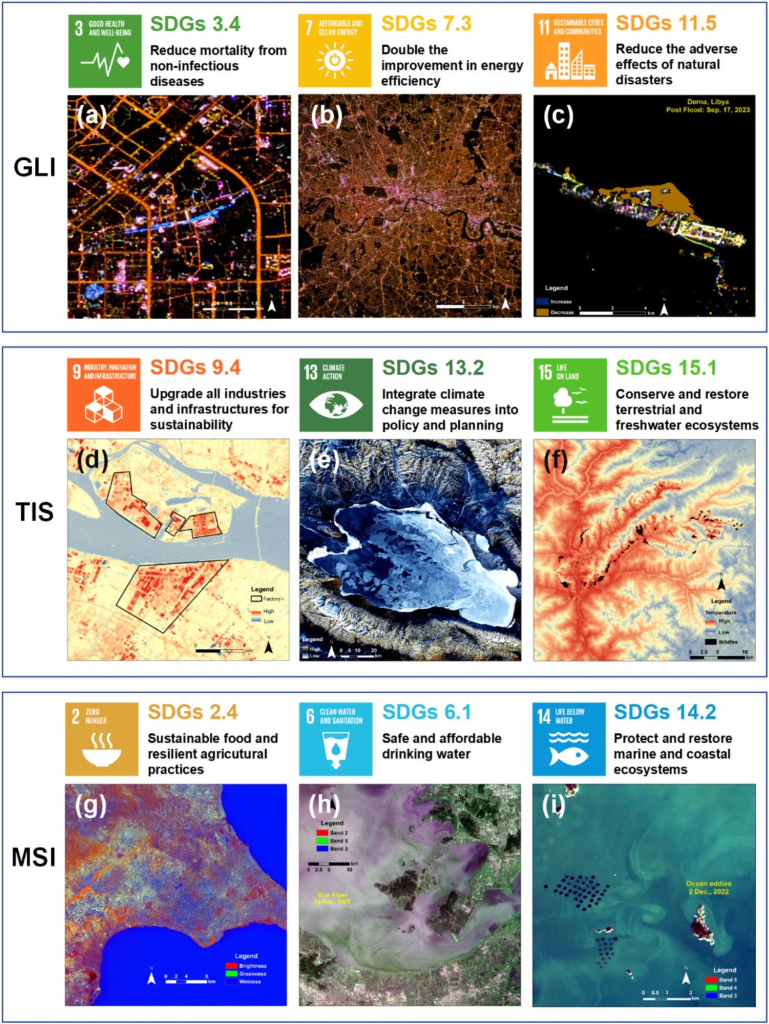 As shown in Figure 3, GLI enables applications in air pollution monitoring (SDG 3), light source classification (SDG 7), disaster damage assessment (SDG 11) and TIS measures industrial heat emissivity (SDG 9), ice dynamics (SDG 13), and wildfire extent (SDG 15). While MSI supports vegetation growth monitoring (SDG 2), lake water quality evaluation (SDG 6), and ocean eddy detection (SDG 14).