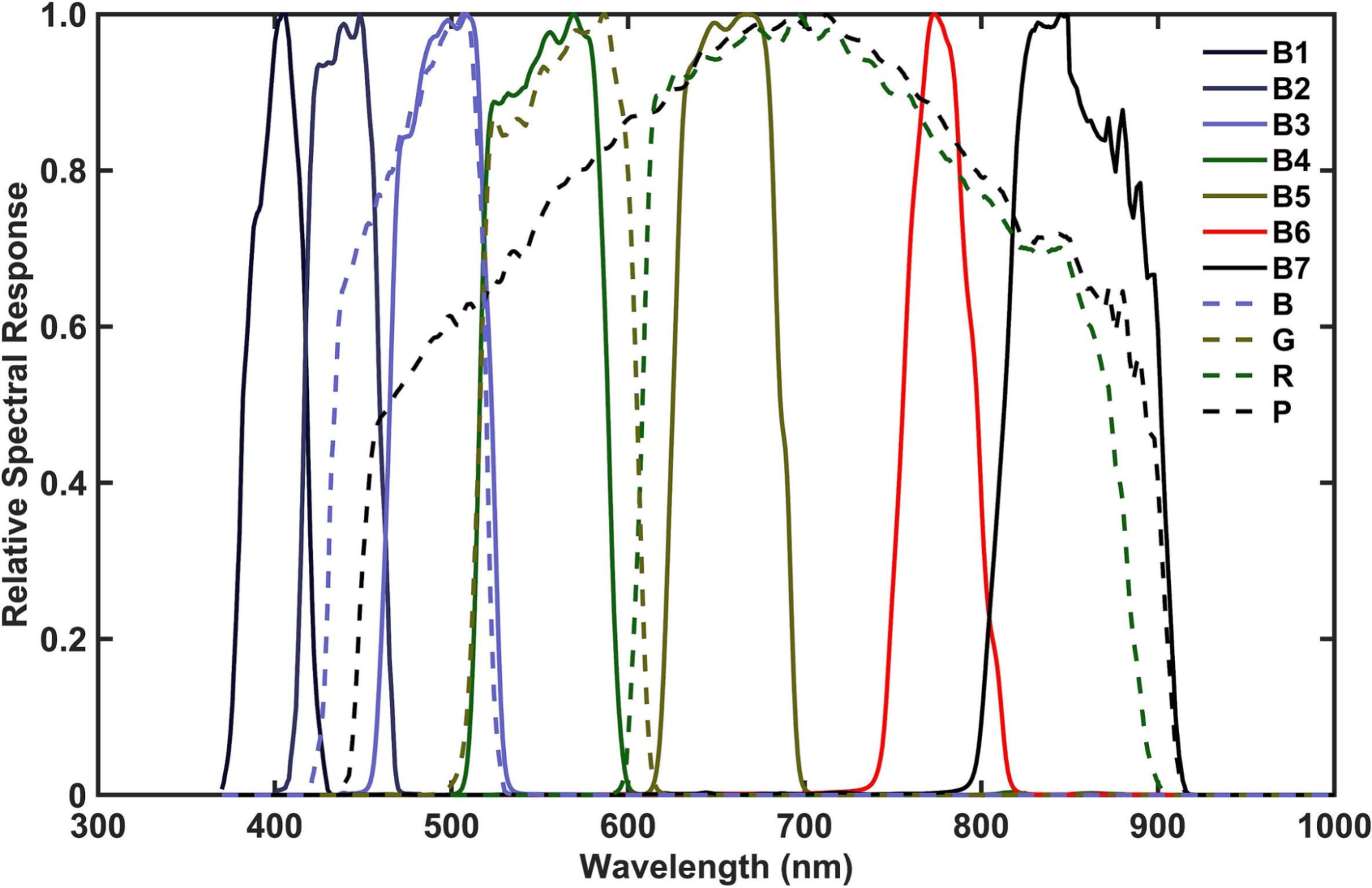 The imaging system uses an array of Complementary Metal Oxide Semiconductor (CMOS) detectors which have been coated by different spectrum filters to allow multiple imaging functions within a single integrated device. This allows GLI to capture in panchromatic, red (R), green (G), and blue (B) bands, and MSI to image across seven multispectral bands. The system uses an electronic imaging driver to switch between the imagers, allowing the GLI to operate during the night, in the TIR+Glimmer data collection mode, and the MSI at daytime in the TIR+Multispectral mode. This is achieved using the face-array CMOS window function, which allows the CMOS sensor to output only the detector lines in the coating region of the panchromatic and RGB bands in the GLI working model for efficient light capture in night imagery. The same function is used to output the seven multispectral bands in the MSI working model for detailed multispectral imaging during daytime operation.1) 8)