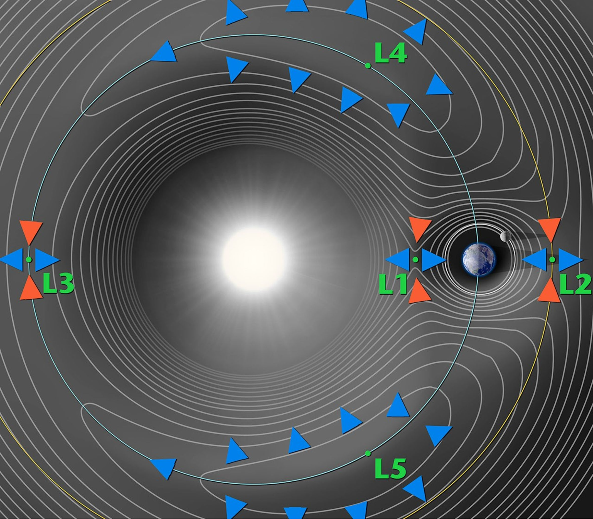 Lagrange points are positions in space where the gravitational pull of two masses precisely equals the centripetal force required to move with them. L1 provides uninterrupted viewing of the sun, and therefore has a history of space weather and solar observation satellite missions. However, L1 is an unstable Lagrange point, meaning objects there are highly susceptible to any gravitational disturbance, and maintaining satellites in position there requires regular adjustments and fuel use. For this reason, SWFO-L1 is placed in Lissajous orbit, around L1. A Lissajous orbit is a quasi-periodic orbital trajectory that an object can follow around a Lagrangian point of a three body system, requiring minimal propulsion. In this orbit, SWFO-L1 will maintain a Sun-Earth-Vehicle (SEV) angle between 13° and 4°, with a period of roughly seven months. 6)