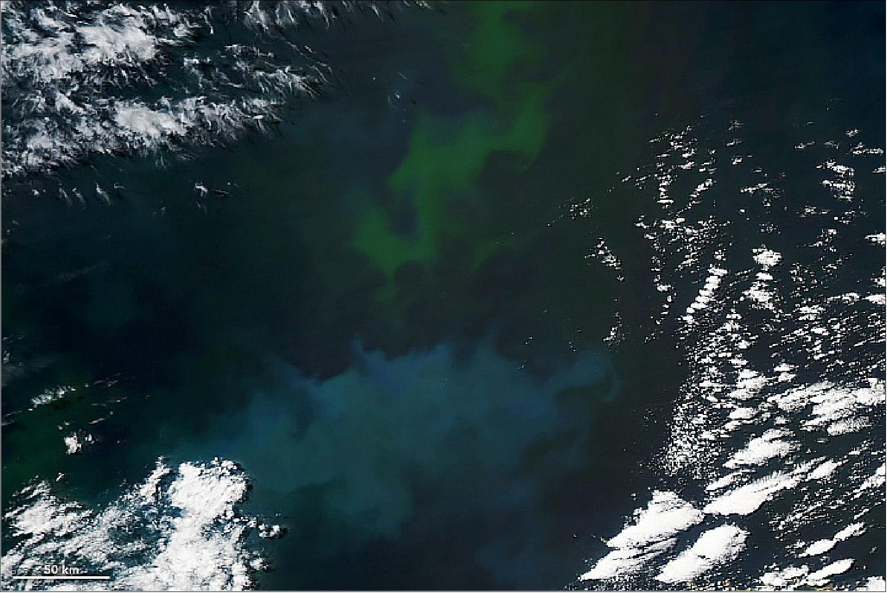• January 28, 2022: Phytoplankton are sometimes called “the grass of the sea.” Like green plants on land, these floating, microscopic organisms play several key roles in making life on Earth possible. First, they are a source of food for zooplankton, shellfish, and marine creatures that eventually become food for other, larger creatures. They also produce a sizable amount of the oxygen in our oceans and atmosphere. And phytoplankton help remove carbon dioxide from Earth’s atmosphere, consuming it during photosynthesis and sinking it to the ocean depths in decaying cells and fecal matter from marine life (a phenomenon known as marine snow). 26)It is not possible to detect specific species from space, but the aquamarine stripes and swirls are likely coccolithophores—phytoplankton with microscopic calcite shells that give water a chalky colour. The various shades of green are probably diatoms, dinoflagellates, and related species. Imagers planned for future satellite missions should make it easier to identify types of phytoplankton from space. The patches of colour, in the images captured by MODIS, not only reveal the presence of phytoplankton, but also trace the edges of the dynamic eddies and currents that carry them. Off the coast of Argentina, Uruguay, and Brazil, warm currents from the tropics flow south and run into cooler currents flowing north from the Southern Ocean. They meet in a place known as the Brazil-Malvinas Confluence. At least seven different water masses of varying temperature, depth, and salinity arrive at this turbulent intersection, leading to vertical and horizontal mixing.