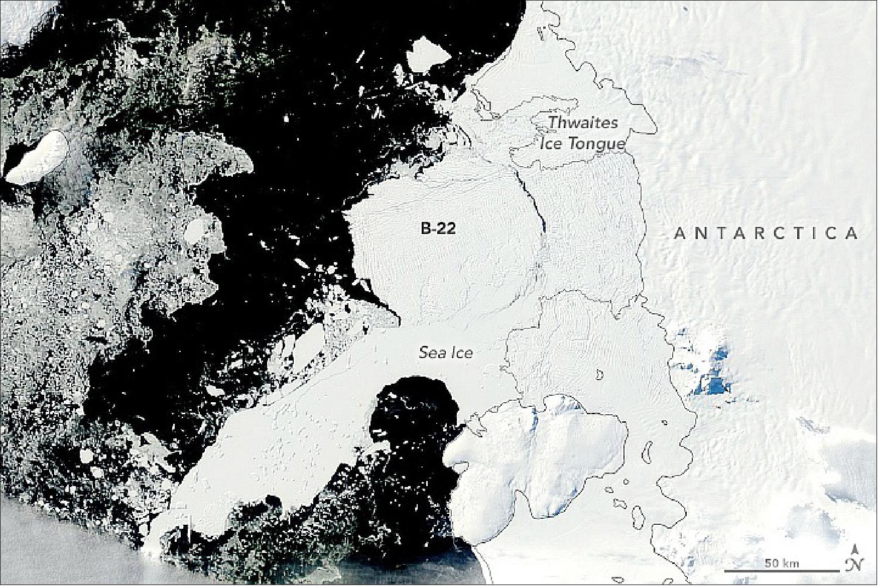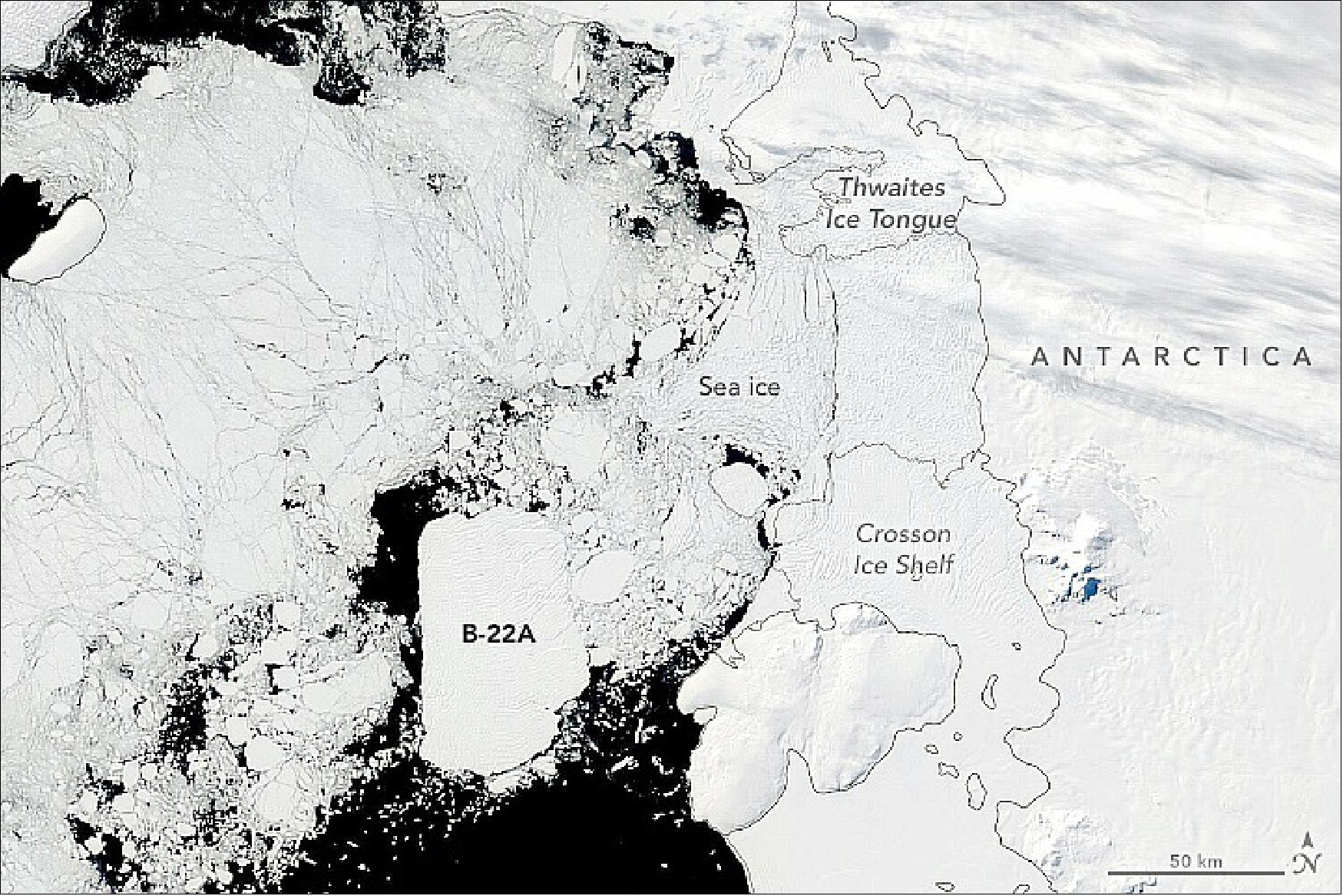 • March 1, 2022: The journey of every Antarctic iceberg is unique. Some drift many thousands of kilometers in the Southern Ocean before disintegrating and melting away. Others, like Iceberg B-22A, stay closer to home. In the span of 20 years, B-22A has strayed just 100 km (60 miles) from its birthplace, the floating ice tongue of Thwaites Glacier. 23) Studies have shown that the grounded iceberg plays an important role in stabilising sea ice in the area. In some years, a band of landfast sea ice has anchored to the iceberg and ice tongue. This landfast ice is thought to help buttress the Thwaites ice tongue and ice shelf, slowing the flow of ice toward the sea.