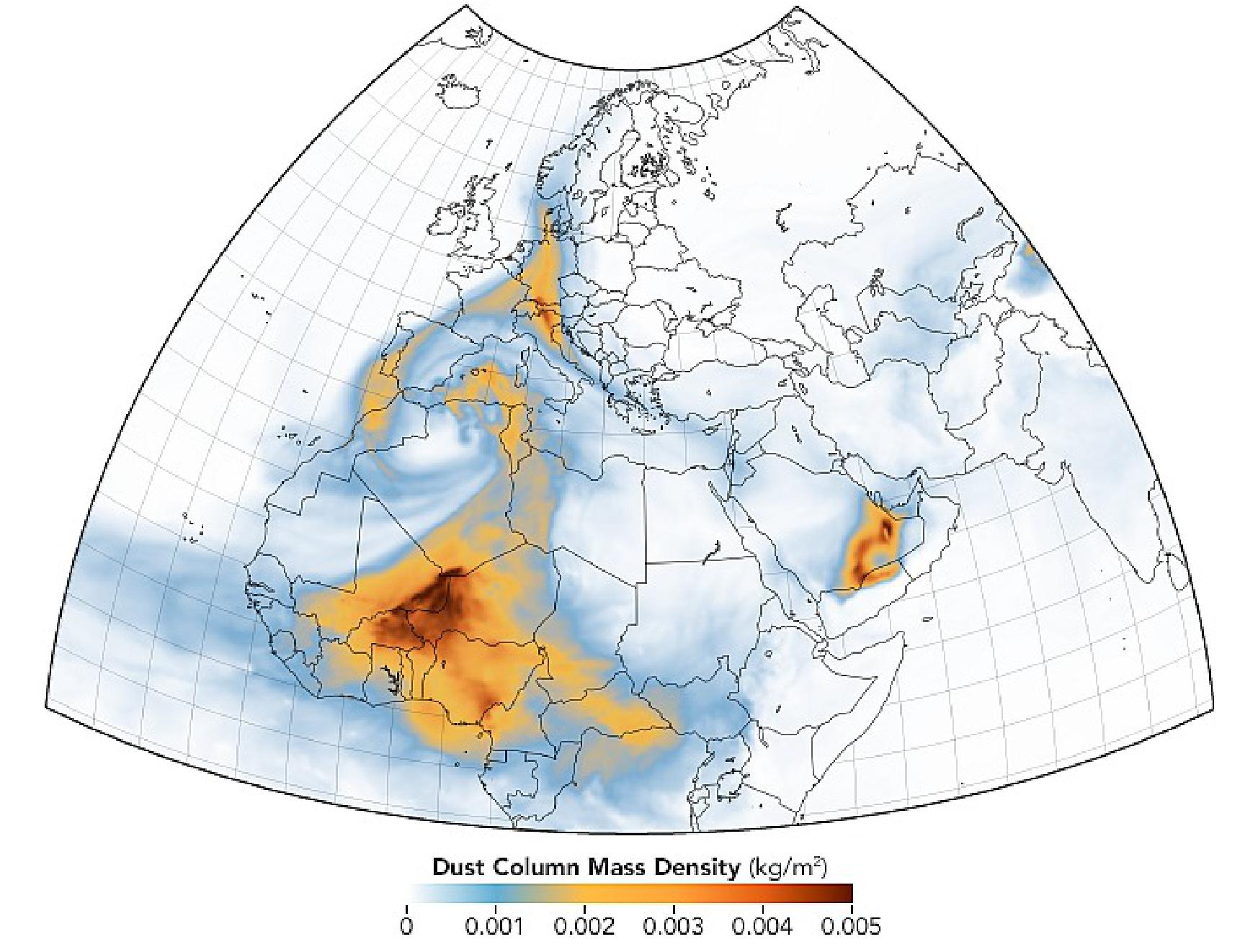 - On March 16, a second storm followed the classic pattern, spinning up closer to the source of the dust in Africa. The large, widespread dust cloud continued moving north over Europe toward Scandinavia and the Arctic Ocean. It then moved east over northern Russia before taking an anticyclonic turn and curving back down into Eastern Europe and the Black Sea region on March 20.