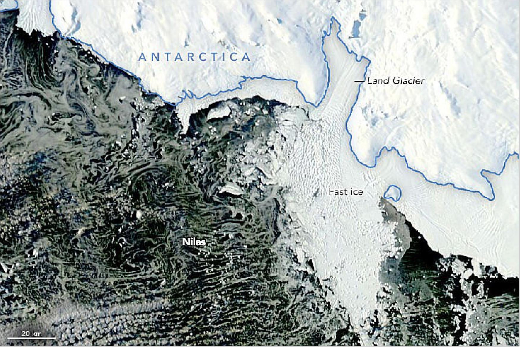 • April 2, 2022: Sea ice around Antarctica started to regrow after reaching the lowest extent ever observed in the satellite record in late February 2022. But on local scales, this transition from melting to freezing can display nuance. For example, near Land Glacier in West Antarctica, an area of old sea ice broke up as new ice formed in March. Around the same time, part of the glacier’s ice tongue crumbled away. 20) The February image displays a vast expanse of sea ice fastened to the edge of the coastline, and to the Land Glacier’s ice tongue and icebergs. Lowe explained that this “fast ice” often has a symbiotic relationship with glaciers and icebergs. Recent research using satellite observations showed that fast ice around parts of Antarctica, including off the coast of Marie Byrd Land, has been decreasing since MODIS records began around 2000. Still, a substantial patch remained at the time of the February image. By March, much of this old fast ice had broken apart. In the March image, the icebergs appear to be turning west into the direction of the remaining sea ice. The Coriolis effect will also influence the bergs’ flow, deflecting them toward the left of their path. Iceberg calving is a natural process for glaciers that terminate in the ocean. The glacier last lost a similar amount of floating ice during the austral winter of 2004. Another stage in the natural lifecycle of sea ice is visible in the March image: the growth of new sea ice.