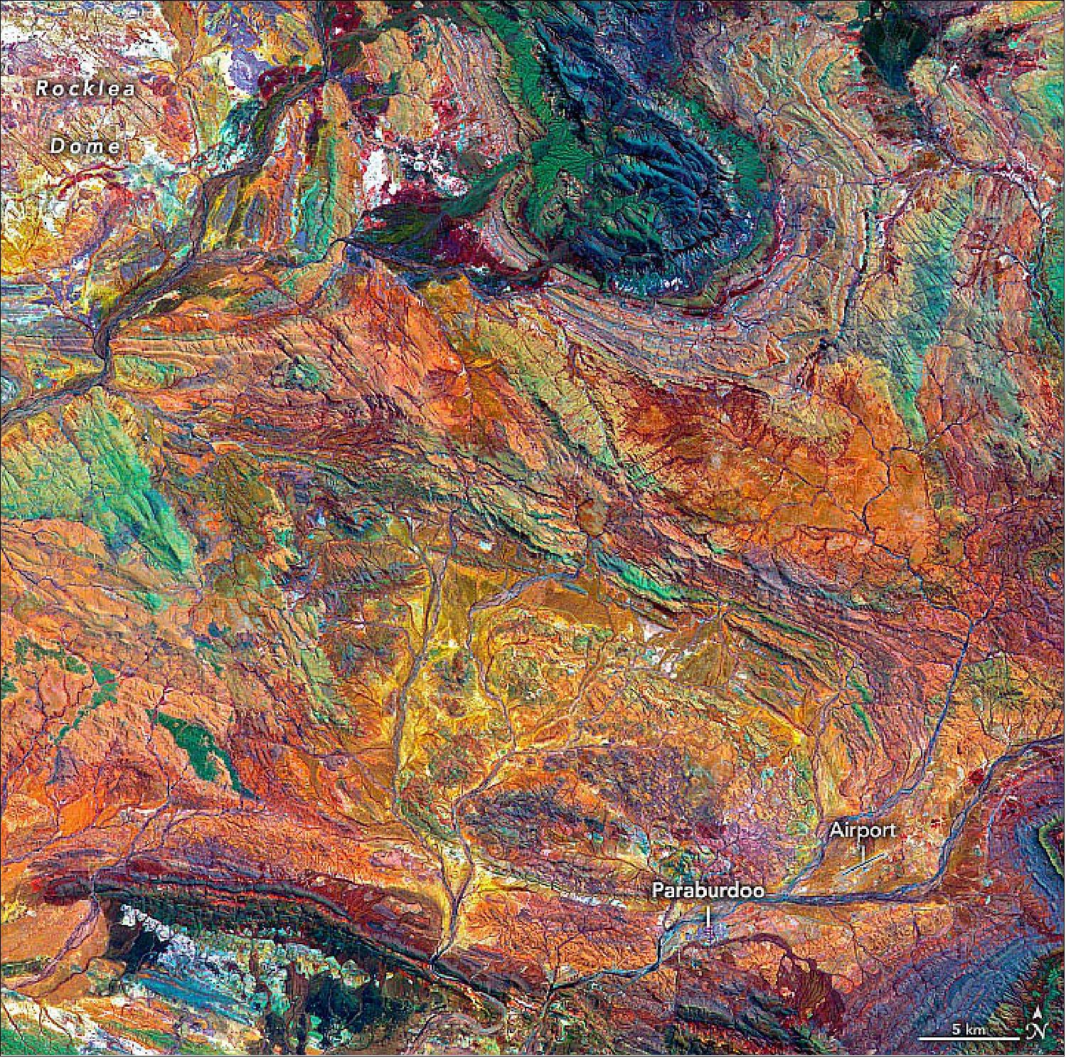 - During the Archean, and the Proterozoic Eon that followed, multiple cratons assembled to form the Australian continent, leaving multiple basins and belts of buckled and folded rocks at their margins. The rocks of the basin preserve a record of the last ocean environment in the area before the cratons converged and closed the basin. Atop the granite and greenstone rocks of the Pilbara Craton lie the younger rocks of the Fortescue, Hamersley, and Turee groups, which were deposited between 2.7 billion and 2.3 billion years ago. Together these rocks form the Mount Bruce Supergroup, which holds a singular place in Australia’s geologic history. According to the Geological Survey of Western Australia, not only do these rocks hold the best-preserved sequence of Archean volcanic rocks, but they also include the most continuous rock record of the transition from the Archean to the Proterozoic 2.5 billion years ago (including a record of the Great Oxidation Event). These iron-rich rocks, including the world’s thickest and most extensive banded iron formations, form the basis of the iron-ore mining industry in the region. For example, in the top center of the image, the knob-shaped outcrop colored blue and green shows the rocks of the Hamersley Group—which includes four major banded-iron formations separated by sequences of iron-poor dolomites, shales, and volcanics. At the top left of the image, the white area shows the southeast portion of the Rocklea Dome, which is composed of light-colored granites.