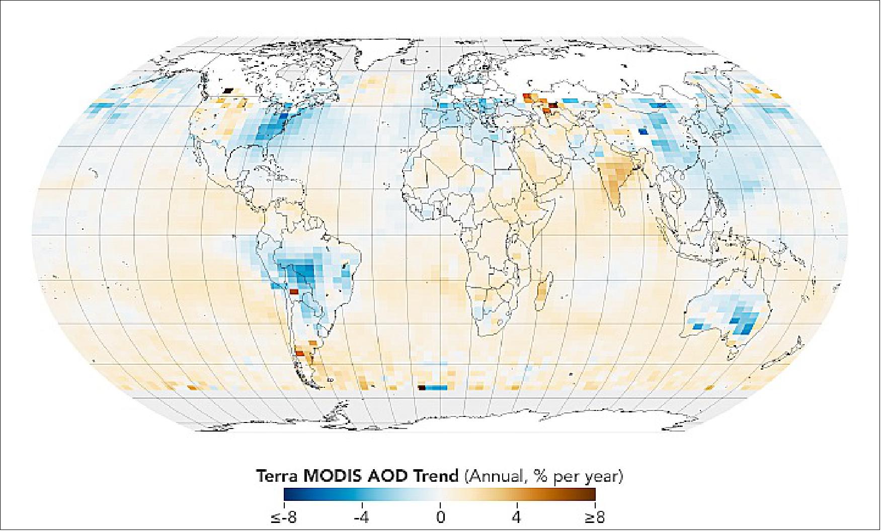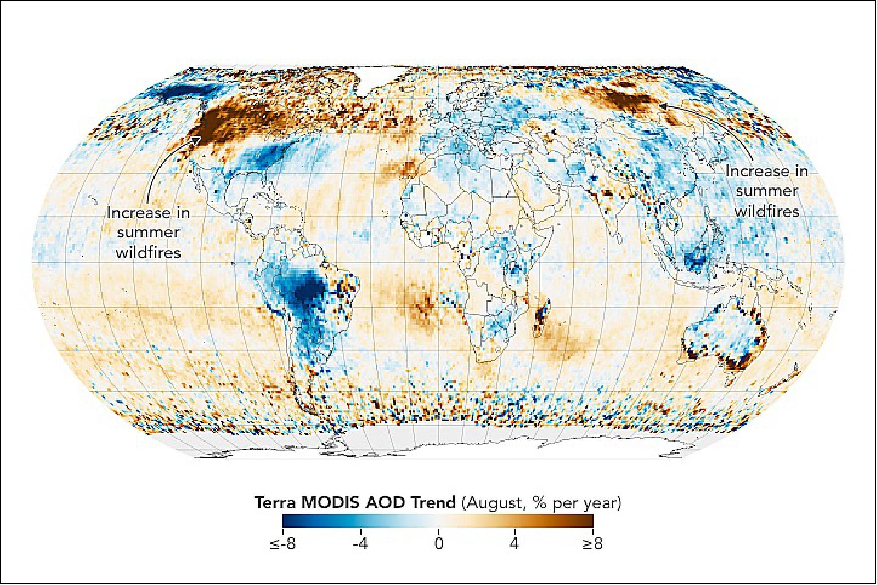 - In addition to analysing carbon monoxide and aerosol trends from MOPITT and MODIS, the researchers also considered observations from other satellite sensors and incorporated insights about regional aerosol emissions from a range of other research. In many places, there has been a trend toward using machinery rather than periodic burning to maintain land in rural areas. Parts of India, the U.S. Pacific Northwest, and the Caspian Sea region have experienced increases in aerosol particles for other reasons. In India, loose environmental controls, combined with growing populations and lots of agricultural burning, has likely fueled the increases in aerosols there. In the western U.S., the aerosol load has increased as drought and climate change have fueled more frequent and intense fires. The extra smoke has potentially exposed as many as 130 million people to toxic substances in recent years and threatens to reverse years of air quality gains. The data indicates a similar process may be playing out in Siberia—another region that has seen increased fire activity in recent years. Terra was launched in 1999 with an expected design life of six years.