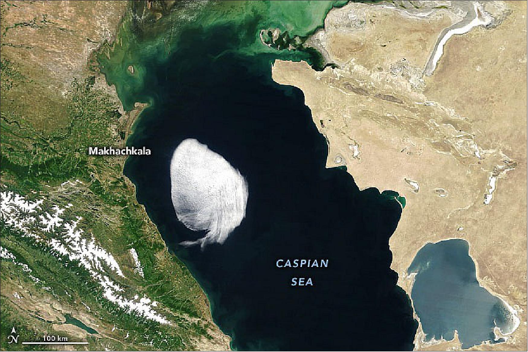 • June 16, 2022: On most days, clouds hover over at least part of the Caspian Sea, the planet’s largest inland body of water. But a cloud that drifted across the Caspian on May 28, 2022, looked more peculiar than most. 14) According to the SRON Netherlands Institute for Space Research, the cloud is a small stratocumulus. The cloud type is puffy like a cumulus cloud; cumulus is the Latin word for “heap” or “pile.” But unlike a cumulus cloud, the “heaps” in a stratocumulus cloud are clumped together, forming a widespread horizontal cloud layer. (Stratus is from a Latin verb that means “to spread out,” or “cover with a layer.”) The stratocumulus pictured here formed a layer spanning about 100 km (60 miles) across. Stratocumulus clouds form at low altitudes, generally between 600 and 2,000 meters (2,000 and 7,000 feet). This cloud was probably hovering at an altitude of about 1,500 meters (5,000 feet). In the late morning, the cloud was poised over the central Caspian. By the afternoon it had drifted toward the northwest and hugged the coast of Makhachkala, Russia, along a low-lying plain near the foothills of the Caucasus Mountains. It then drifted across the sea and dissipated when it reached land. The scenario also explains the cloud’s well-defined edges.