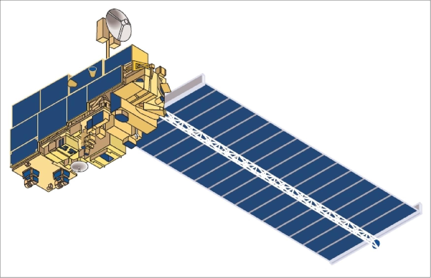 Terra features a three-axis stabilised spacebus developed by Lockheed Martin Missiles and Space (LMMS) with a truss-like primary structure. A large single-wing, rotating solar array maximises power generation. The primary telemetry data transmission is via a Tracking & Data Relay Satellite (TDRS) system which utilises Ku-band, S-band and X-band transmission. A TDRS Onboard Navigation System (TONS) performs orbit determination to estimate Terra’s velocity, drag coefficient and master oscillator frequency bias. Developed with an initial design life of six years, the spacecraft has a total launch mass of 5190 kg which includes an onboard payload mass of 1155 kg.