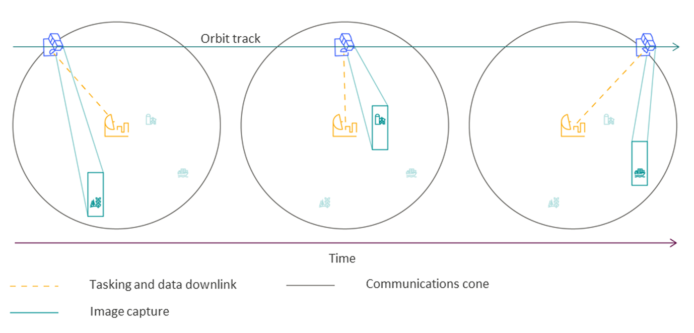 Due to some customers requiring satellite services outside of the internet, particularly those in defence, Maxar also allows customers to receive and task imagery directly from the satellite or from mobile ground stations. The satellites also support simultaneous uplink and downlink of data, which is illustrated in Figure 9. In order to point at successive targets while maintaining contact with the ground, the downlink antenna needs to be steerable from the main sensor.